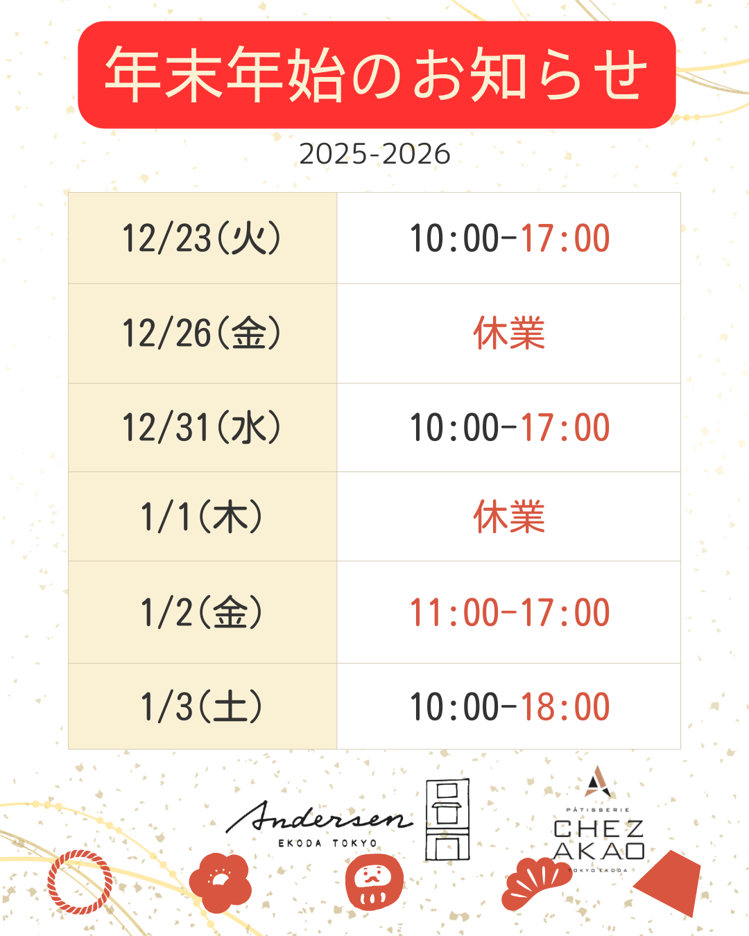 By andersewpnmaster| 2025-12-23T01:36:23+00:00 12月 23rd, 2025|お知らせ|年末年始営業時間のご案内 はコメントを受け付けていません。